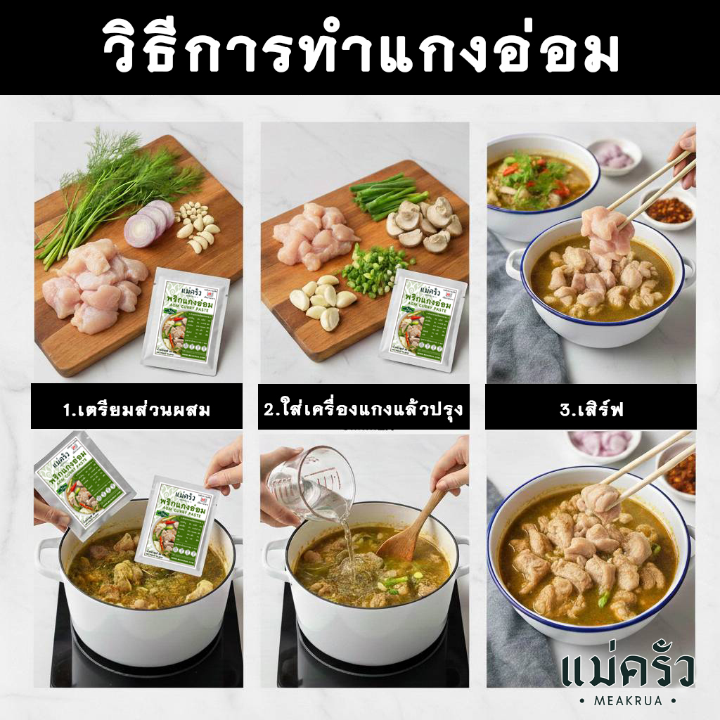 ต้มน้ำให้เดือด ละลายพริกแกงอ่อม 1 ซอง ใส่เนื้อสัตว์และผัก (เช่น กะหล่ำปลี ผักชีลาว มะเขือ) ปรุงรสตามชอบ พร้อมเสิร์ฟความสดชื่น !